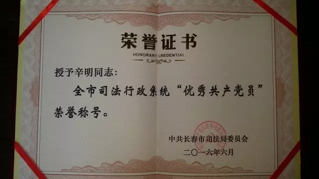 2016年6月24日,中共长春市司法局委员会在长春市司法局二楼会议室隆重召开“光辉的历程——长春市司法局纪念建党95周年大会”。在会议上,局党委宣布了对全市司法行政系统表现突出单位和个人进行集中表彰的决定,并授予部分先进党员和基层组织“优秀共产党员”、“优秀党务工作者”和“优秀基层党组织”荣誉称号。衡丰所辛明律师因表现优秀,成为律师行业受表彰的两名“优秀共产党员”中的其中一名。