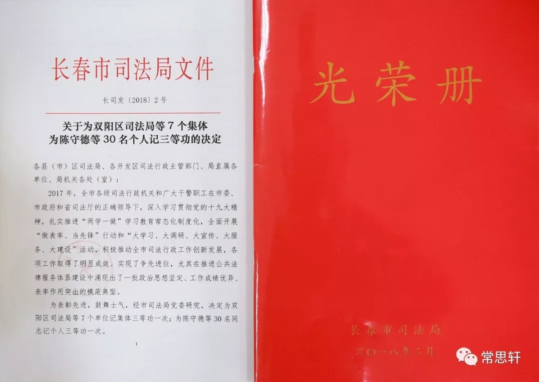 为进一步表彰先进、弘扬正气、激励斗志,推动全市司法行政队伍既政治过硬又本领过硬,推动全市司法行政工作不断取得新进步、开创新局面,在新春佳节即将来临之际,长春市司法局党委决定为双阳区司法局等7个单位记集体三等功一次,为陈守德等30名同志记个人三等功一次。这些受到表彰的集体和个人是全市司法行政机关忠诚使命、无私奉献的杰出代表。他们的先进事迹生动诠释了对党忠诚、信念坚定的政治品格,生动诠释了履职尽责、敢于担当的职业操守,生动诠释了牢记宗旨、执法为民的爱民情怀,生动诠释了克己奉公、清正廉洁的优秀品质,充分展现了新时代司法行政队伍的良好形象。